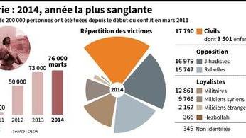 Alors que les combats ne connaissent aucun répit entre rebelles et troupes du régime, mais aussi entre rebelles et jihadistes, l'Observatoire syrien des droits de l'Homme (OSDH) a fait état de 76.000 personnes tuées en Syrie en 2014, contre plus de 73.000 en 2013 et près de 50.000 en 2012.