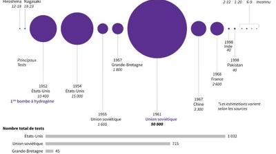 Le 1er novembre 1952, les Etats-Unis faisaient exploser secrètement ce nouveau type d'engin dans les îles Marshall, en plein océan Pacifique. Un an plus tard, l'URSS annonçait à son tour un tir thermonucléaire. La puissance de la plus grosse bombe H à avoir jamais explosé, l'essai soviétique "Tsar Bomba", le 30 octobre 1961 au dessus de l'Arctique, était de 57 mégatonnes, une puissance théoriquement près de 4.000 fois supérieure à la bombe sur Hiroshima.