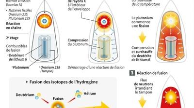 Les bombes A libèrent une énergie déclenchée par la fission d'éléments comme l'uranium ou le plutonium. Celles à hydrogène - ou thermonucléaires - utilisent d'abord la technique de la fission, puis celle de la fusion nucléaire dans une réaction en chaîne.