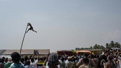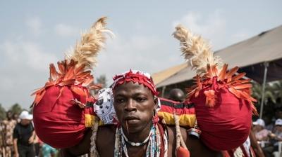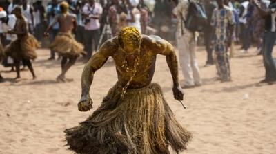 Il s'interrompt pour prendre une vidéo sur son smartphone: un homme escalade à mains nues une simple tige de bambou de près de 15 mètres de haut. La foule exulte. Un peu plus loin des hommes recouverts d'un mélange de terre ocre dansent en transe au rythme des djembés et font des offrandes aux fétiches.