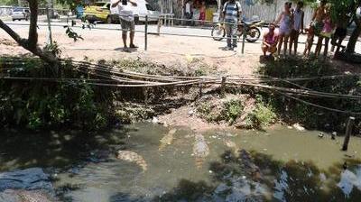 L'endroit est connu comme "bica dos jacarés" ("le robinet des caïmans", NDLR). L'énorme tuyau de la Cedae passe juste au-dessus d'un canal étroit devenu un égout où pullulent les caïmans, appelés "jacarés" au Brésil.