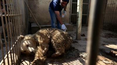 Simba le lion et Lula l'ours tournent en rond, le pelage recouvert de boue et d'excréments: ces deux derniers pensionnaires d'un zoo de Mossoul dévasté par les combats sortent enfin de l'oubli.