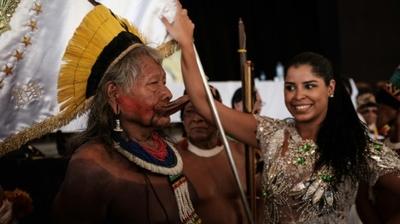 Le chef indien de 86 ans, connu dans le monde entier pour arborer un grand plateau labial, s'est aussi insurgé contre la construction d'une grande centrale hydraulique en Amazonie, critiquée de façon poétique dans les paroles de la chanson officielle d'Imperatriz.