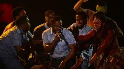 Le rappeur avait enchaîné sur "Alright", titre devenu l'hymne non-officiel du mouvement protestataire "Black Lives Matter" ("Les vies des Noirs comptent"), cette fois au milieu d'un ensemble chorégraphique de danse africaine, devant un gigantesque brasier.