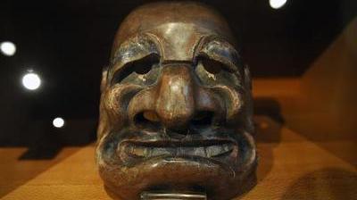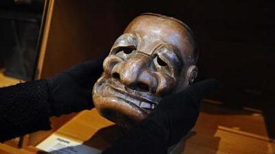 C'est un masque japonais en bois du 18e siècle, pas une marionnette célèbre de la télévision, pourtant ce personnage du théâtre Nô évoque irrésistiblement la caricature de l'ancien président Jacques Chirac aux Guignols de l'Info de Canal+.