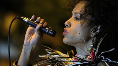 Difficile de lui donner tort: la scène est couverte de guirlandes de fleurs, elle et ses musiciens sont costumés et dégagent une incroyable énergie, associant accordéon, percussions, guitare, et sourdes basses électro lancées depuis un ordinateur.