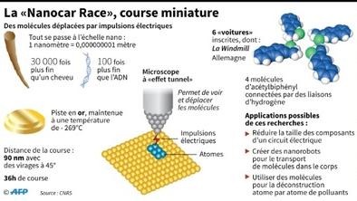 C'est une course automobile internationale totalement inédite: fin avril, quatre "bolides" invisibles à l’œil nu et constitués de quelques centaines d'atomes seulement vont concourir en France sur une piste 50.000 fois plus fine que l'épaisseur d'un trait de stylo à bille...