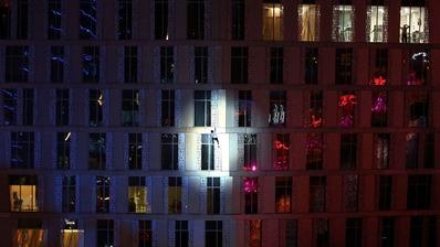 Les 73 étages de la tour torsadée étaient éclairés par de puissants projecteurs au moment de l'ascension qui s'est déroulée sous le regard médusé des spectateurs au sol, parmi lesquels de nombreux touristes étrangers.