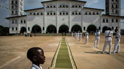 "Peloton à l’honneur! À gauche, gauche!" Les cantiques de louange qui ont résonné pendant plusieurs heures dans l’immense temple de Nkamba ont fait place à une musique plus militaire et la foule des fidèles vient présenter les honneurs au Saint-Esprit lui-même.
