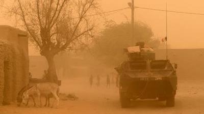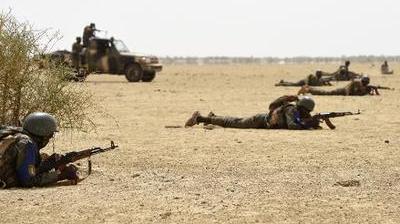 Les pick-up couleur sable de l'armée malienne et les blindés français prennent position sur les collines alentour, pour sécuriser les lieux dans une région où opèrent à peu près librement de multiples bandes armées: jihadistes ayant échappé à l'opération Serval en 2013, qui a précédé Barkhane, combattants touareg, arabes ou autres, voire simples brigands...