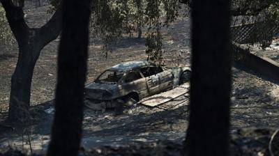 A quelques kilomètres de là, un gendarme empêche les journalistes de s'approcher d'une voiture calcinée à l'entrée du village de Nodeirinho, entouré d'une forêt d'eucalyptus et de pins dévorés par les flammes. Du sol noirci s'échappent encore quelques petites colonnes de fumée grise.