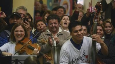 Dans le hall central de l'hôpital public Alvarez, où les usagers attendent leur rendez-vous, l'ensemble de 70 musiciens termine d'interpréter un extrait de La Traviata, opéra de Verdi. Les applaudissements et les bravos retentissent.