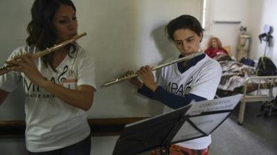 Dès le premier accord, l'ambiance change dans l'hôpital Alvarez de Buenos Aires: les notes de Brahms résonnent, la musique ne soigne pas mais elle soulage l'âme des malades. Depuis les balcons et les escaliers, le personnel de l'hôpital et les internes qui peuvent se déplacer observent le spectacle.