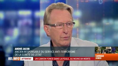 La tuerie de masse survenue à Nice est analysée par les spécialistes. André Jacob, ancien responsable du service anti-terrorisme de la sûreté de l’Etat, a considéré que le seul moyen d'éviter ce genre de carnages était d'organiser des périmètres de sécurité, dans des endroits fermés avec contrôle. "Il serait intéressant de voir le temps que cela a pris, c'est peut-être 1 minute, 1 minute 30, souligne André Jacob. Les policiers étaient sur place, mais éparpillés, pas dans une action de contrôle d'un territoire, d'un endroit qui serait fermé. (...) Il est impossible, sauf si l'on fait des zones fermées comme les fans zones durant l'euro, et que l'on contrôle les gens à l'entrée, à la sortie avec périmètre de sécurité, c'est impossible d'empêcher un camion de ce tonnage de pénétrer et d'écraser des gens".