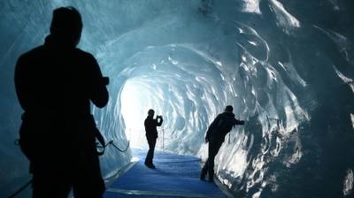 Depuis la gare du Montenvers, à 1.913 mètres d'altitude, il faut d'abord emprunter une télécabine pour descendre au niveau où se situait le glacier en 1946. C'est depuis cette date qu'est creusée chaque année la grotte de la Mer de Glace, une attraction avec sons, lumières et sculptures de glace qui attire 350.000 visiteurs par an.