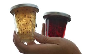 A l'arrivée, les petits pots de 85g sont vendus 18 à 20 euros. En transparence, on y devine les fruits entiers, perceptibles en bouche.