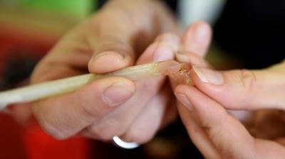 Puis arrive la plume. Le geste est précis, et nécessite "au moins deux ou trois saisons" de pratique pour être effectué rapidement, explique la jeune femme, joignant le geste à la parole. D'une main, elle tient la groseille, introduit la pointe de la plume en son centre et en ressort les pépins - environ 7 à 8 par fruit - sans altérer la chair, avant de refermer la groseille.