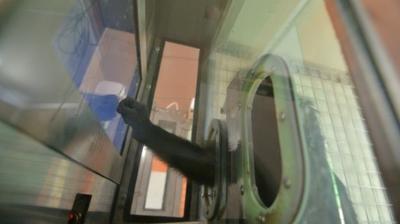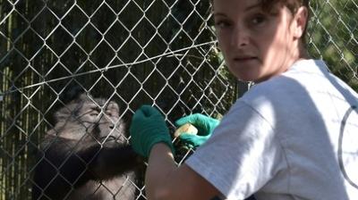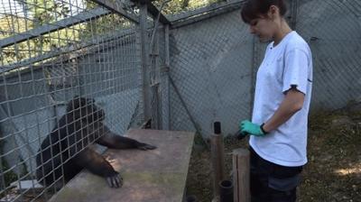 Au centre de primatologie de Niederhausbergen, deux chercheuses en éthologie actionnent les trappes pour faire entrer les singes et scrutent leur comportement.
