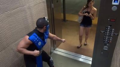 Déguisé en Sub-Zero, un personnage du jeu vidéo Mortal Kombat, ce jeune homme aux gros bras va effrayer les gens qu’il croise dans ascenseur. Une caméra cachée filme leurs réactions.