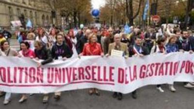 "Non aux mères porteuses", "protégeons la famille": des milliers de manifestants ont commencé à défiler dimanche en début d'après-midi à Paris à l'appel de la Manif pour tous, de retour dans la rue après avoir combattu en vain le mariage homosexuel. Le cortège s'est ébranlé à 13H15 de la Porte Dauphine pour rejoindre Montparnasse. Parmi les manifestants, des adultes et des enfants, des jeunes ou retraités brandissent drapeaux français ou les étendards bleu, blanc ou rose de la Manif pour tous (MPT). "La déconstruction en cours de la politique familiale est désastreuse, cette déconstruction s'accélère", a estimé Ludovine de la Rochère, présidente du collectif. En ligne de mire, la procréation médicalement assistée (PMA) ou encore la gestation pour autrui (GPA). Egalement ciblé, le coup de rabot annoncé sur les allocations familiales, et un enseignement à l'école d'une théorie du genre niant selon le collectif les différences entre les sexes. La question d'un recours aux mères porteuses cristallise la plupart des craintes, malgré les garanties récemment apportées par le Premier ministre, Manuel Valls, qui a assuré qu'elle "est et sera interdite" en France. Le gouvernement n'a toutefois pas contesté dans le délai imparti des arrêts de la Cour européenne des droits de l'Homme ayant contraint en juin la France à reconnaître les enfants nés d'une mère porteuse à l'étranger. Nombre de sympathisants de droite et d'extrême droite sont favorables aux idées de la MPT. Plusieurs élus de l'UMP, parmi lesquels Hervé Mariton, Michèle Alliot-Marie, Laurent Wauquiez participaient d'ailleurs à la manifestation ainsi que Christine Boutin (Parti chrétien-démocrate) et également une délégation du Front national. Un rassemblement est également prévu à Bordeaux à partir de 14H00. (Belga)