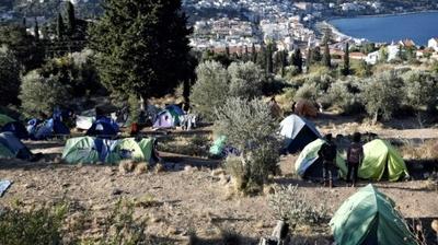 Près de 300 Syriens, Irakiens, Afghans et Africains de divers pays vivent dans ce camp improvisé situé sur une colline plantée d'oliviers, sur cette île grecque par ailleurs idyllique.
