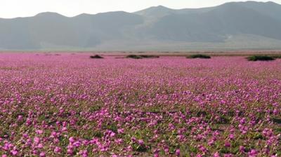 Une gigantesque étendue de fleurs colorées tapisse actuellement le sol le plus aride du monde, celui du désert d'Atacama au nord du Chili, un phénomène cyclique dû au redouté "El Niño", mais qui, ici, ravit spécialistes et touristes.