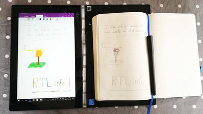 On peut aussi poser sur cette zone un carnet de note (aimanté et inclus), mettre une mine avec de l’encre dans le stylet (trois mines fournies), et... écrire. Tout ce qui est écrit ou dessiné sur le carnet est retranscrit instantanément sur le logiciel OneNote de Microsoft (sur la version Windows 10 Pro à 599€), qui par ailleurs se propose à l’ouverture lorsqu’on appuie sur le bouton.