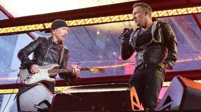 Mais comme Bono s'est blessé assez grièvement dans un accident de vélo le mois dernier, les superstars irlandaises ont passé le micro à Bruce Springsteen et au chanteur de Coldplay.
