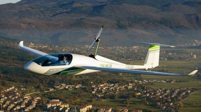 Charger la batterie, pousser le bouton qui lance l'hélice sur le fuselage, la rétracter lorsque l'aéronef commence à planer puis écouter: seul le bruit de l'appareil fendant l'air accompagne le survol de la campagne slovène.