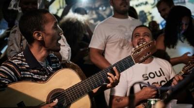Au milieu de la foule, sept jeunes musiciens assis autour d'une table jouent du cavaquinho (petite guitare), de la cuica (tambour à friction) et du tambourin, comme ont commencé à le faire au XIXe siècle, de façon clandestine, les esclaves noirs venus du nord-est pour travailler dans les docks de Rio.