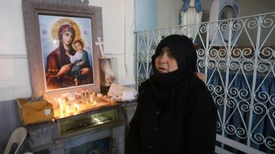 La localité compte neuf églises, parfois très anciennes. Seules trois d'entre elles sont encore ouvertes, dont l'église Théodore, où des femmes assistent à une messe en syriaque. "Comment pourrais-je partir alors que mon fils est au front pour me défendre et défendre le village?", interroge Chams Abboud, une femme au foyer de 62 ans. Sur la façade de l'église est accrochée une énorme pancarte avec les portraits d'une soixantaine "de martyrs de Sadad", la plupart en habits civils, dont des femmes âgées. Le drapeau syrien apparaît en arrière-plan des photos.