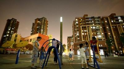 Dans un parc du quartier, des enfants gambadent joyeusement sous le regard bienveillant de statues de pierre vantant la politique de limitation des naissances, imposée dès la fin des années 1970 pour ralentir la croissance démographique.