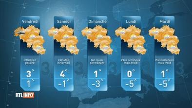 Vendredi et samedi, on se retrouvera dans des courants d'origine polaire. On prévoit dès lors de nombreux nuages et porteurs d'averses de pluie ou de neige fondante en plaine et de neige sur les hauteurs. Samedi, le risque d'averses pourrait déjà être moins important et concerner surtout le sud-est du pays et le littoral. On perdra quelques degrés avec des maxima proches de 3 degrés dans le centre mais avec du gel en Ardenne.