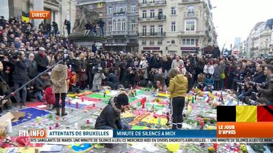 Des centaines de personnes se sont réunies mercredi midi pour respecter une minute de silence sur la place de la Bourse au coeur du piétonnier transformé depuis mardi en lieu de rassemblement spontané de la population en deuil à la suite des attentats qui ont frappé la capitale belge. A 12h00 précises, la foule présente sur la place a respecté une minute de silence ci et là interrompue par les crépitements des appareils photo des journalistes, et les propos incohérents qu'un homme s'est soudainement mis à crier. La minute de silence s'est achevée par un "vive la Belgique" anonyme, aussitôt repris par le public qui a longuement applaudi. De brèves prises de paroles spontanées ont également ponctué l'événement, ainsi que des chants. Bon nombre de personnes présentes ont déposé des bougies, des fleurs et des drapeaux belges sur la place. D'autres inscrivaient sur le sol des messages en mémoire des victimes avec des craies de couleur. Vers 12h30, un attroupement s'est créé au milieu de la place autour d'une femme voilée, manifestement perturbée, et qui hurlait des propos en arabe notamment à l'encontre des musulmans et du Maroc.