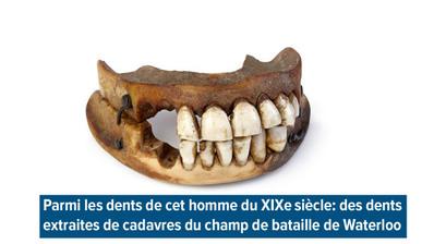 Après la bataille de Waterloo, des milliers de cadavres gisaient au même endroit et ont suscité l'intérêt des pilleurs de tombes. "Il y avait des tas de cadavres dans un endroit concentré. Les dents ont été arrachées par des soldats survivants, des locaux ou des charognards venant expressément de Grande-Bretagne", explique Mme Bairsto. Les dents récupérées et revendues aux "dentistes" de l'époque étaient ensuite triées et taillées. Le terme "Waterloo Teeth" s'est ensuite appliqué aux récupérations de dents sur les champs de bataille du XIXe siècle. Ce n'est qu'à partir de la moitié du XIXe siècle que les dents en porcelaine ont fait leur apparition et que les dents humaines ont été abandonnées pour la confection de dentiers. (Belga)