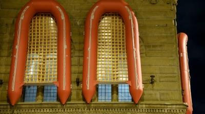 Mais c'est avant même d'entrer dans le palais que le visiteur se retrouve interpellé par l'artiste, qui a aligné sur les façades de ce joyau architectural de la Renaissance italienne un total de 22 canots orange encadrant les fenêtres du deuxième étage.