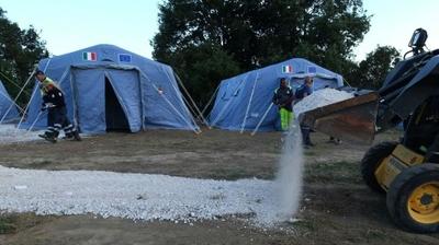 Une douzaine de grandes tentes bleues sont alignées dans un champ à l'entrée de ce hameau de la commune d'Accumoli, séparées par des petits sentiers de graviers signalant que le provisoire est prêt à durer.