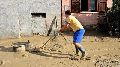Ce magasinier de 30 ans retient ses larmes en ramassant les jouets de son fils couverts de boue, qu'il jette sur des meubles empilés dans la rue à Pianello di Ostra, où quatre personnes ont été tuées.