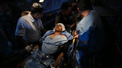 Douze personnes, quelques-unes touchées aux jambes et dans des fauteuils roulants, mais la plupart sur des civières, en sont extraites avec précaution par les militaires, sous l'oeil vigilant de médecins.