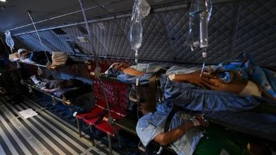 Alors que la nuit tombe, un ballet d'ambulances s'ajoute à celui des avions. L'une après l'autre, elles traversent le tarmac et s'approchent d'un appareil de la force aérienne équatorienne.