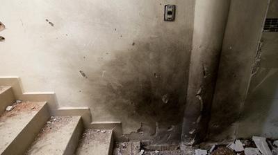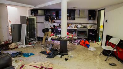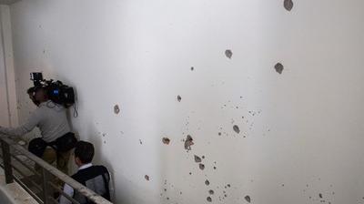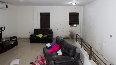 Dans la salle principale, on aperçoit des impacts de balles et de grenades. La cuisine partiellement détruite offre un spectacle de désolation, avec des aliments renversés, en état de décomposition, qui imprègnent l'atmosphère. L'air semble se raréfier lorsqu'on s'enfonce dans la maison pour atteindre une chambre humide, qui accapare l'attention des médias.