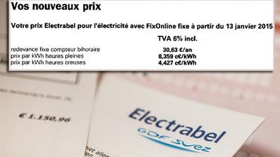 Et au final, le prix du kilowatt grimpe de 17%. Celui de votre facture d'environ 5%. Ces chiffres ne concernent que le tarif "FixOnline", que nous avons pu vérifier auprès de deux clients distincts, basés dans le Brabant wallon.