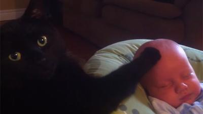 Voici un chat qui sait y faire avec les bébés. Quand ce poupon ne peut s’arrêter de pleurer, il intervient pour le caresser avec sa patte.