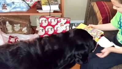Regardez le déballer les cadeaux à coups de mâchoire. Espérons tout de même que Benny n'a pas pris au goût au papier cadeau. Une nourriture sans doute pas très saine...