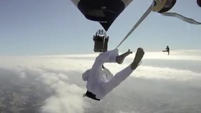 Un second tente l’expérience et parvient à faire quelque mètre de plus... Malheureusement, il tombe dans le vide sous le rire des autres. Il faut avoir beaucoup de sang froid pour effectuer cette prouesse. Non seulement, les aventuriers tentent de s’élancer sur une corde entre deux ballons, mais s’ils tombent, aucune corde ne les retient. Sur leur dos, ils ont un parachute qu’ils doivent encore penser à enclencher s’ils tombent de la corde.