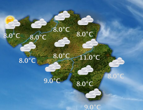 Demain, le ciel sera généralement très nuageux avec de faibles pluies ou bruines à partir de sud. Les maxima varieront entre 7 et 11 degrés dans le sud-est du pays et aux alentours de 8 degrés dans les autres régions. Le vent sera généralement faible d'est, en cours de journée parfois modéré dans certaines régions.