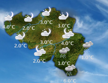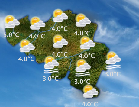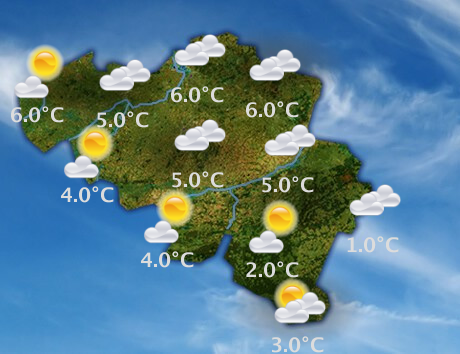 Après la dissipation de la grisaille matinale présente par endroits, le temps sera d'abord assez ensoleillé mais, ensuite, des nuages bas envahiront notre pays à partir du nord-est et le ciel deviendra alors très nuageux à couvert. Les maxima se situeront entre 2 et 6 degrés, sous un vent modéré de secteur est à nord-est.